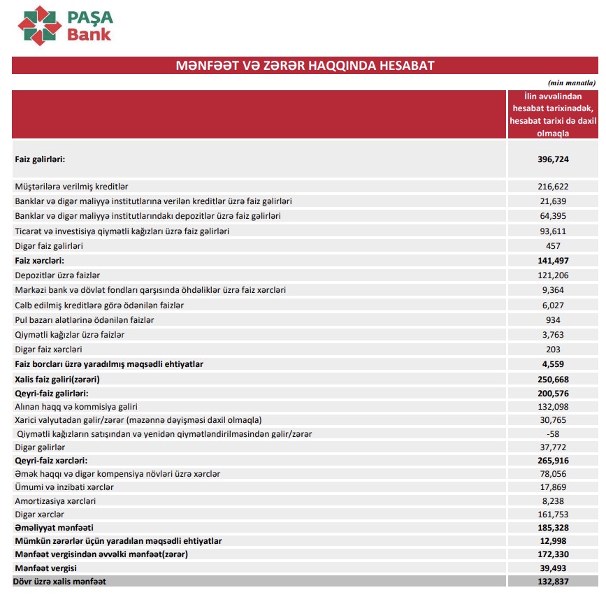 Hesabat dövründə “PAŞA Bank”ın xalis mənfəəti 132 milyon 837 min manat təşkil edib. Bu, ötən ilin eyni dövründəki 146 milyon 778 min manatdan 13 milyon 941 min manat (9,5%) azdır. Faiz xərclərinin və ümkün zərərlər üçün yaradılan ehtiyatlara ayrılan vəsaitin artması xalis mənfəətə təyiq yaradıb.