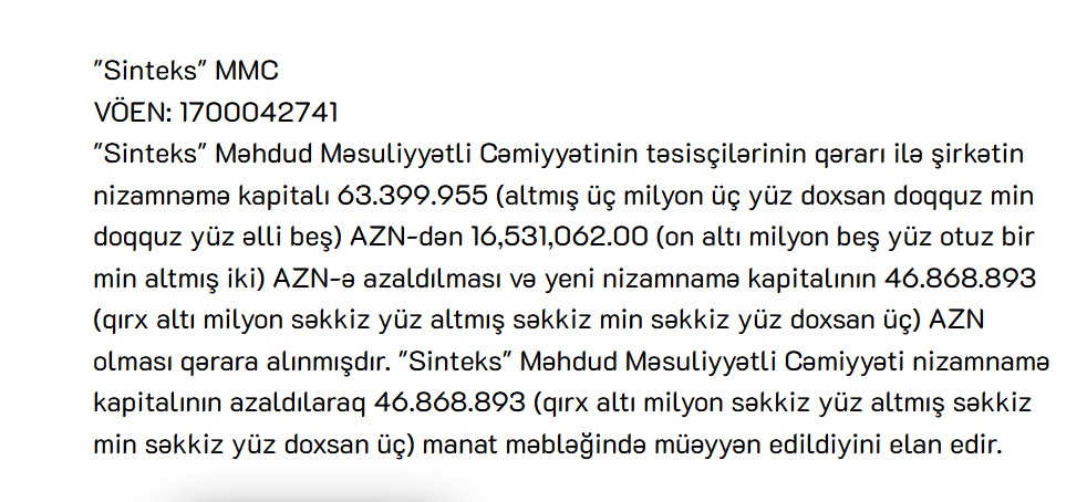 Tanınmış markaların Azərbaycanda rəsmi təmsilçisi olan "Sinteks" MMC-nin nizamnamə kapitalı 16 milyon 531 min 62 manat və ya 26,1% azaldılaraq 46 milyon 868 min 933 manata endirilib.