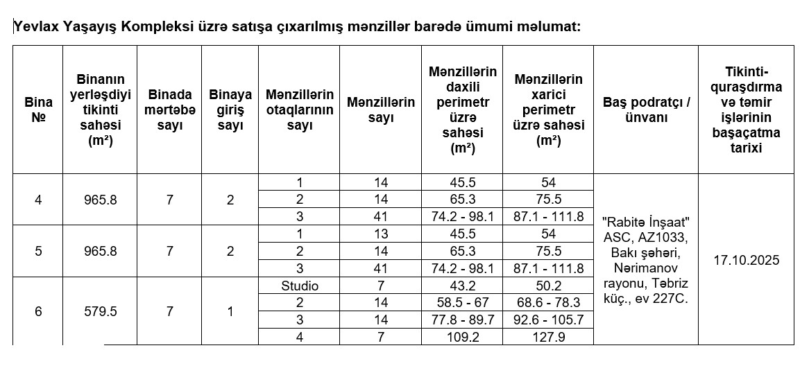 Elanda bildirilir ki, Bakı şəhəri, Suraxanı rayonu, Hövsan qəsəbəsi, Zığ şossesi-Hava Limanı 12-ci km. “22” ünvanında yerləşən Hövsan Yaşayış Kompleksinin birinci mərhələsi üzrə 1 mənzilin, Bakı şəhəri, Suraxanı rayonu, Hövsan qəsəbəsi, Hava Limanı-Zığ şossesi 8-ci km, “10L” ünvanında yerləşən Hövsan Yaşayış Kompleksinin ikinci mərhələsi üzrə 7 mənzilin, Sumqayıt şəhəri, Bulvar küçəsi, 197 ünvanında yerləşən Sumqayıt Yaşayış Kompleksi üzrə 10 mənzilin, Lənkəran şəhəri, Akademik Zərifə Əliyeva küçəsi, 303 ünvanında yerləşən Lənkəran Yaşayış Kompleksi üzrə 10 mənzilin, Bakı şəhəri, Binəqədi rayonu, Binəqədi qəsəbəsi, 10 may küçəsi, 590 saylı sahə ünvanında yerləşən Binəqədi Yaşayış Kompleksi üzrə 204 mənzilin, Şirvan şəhəri, Naxçıvan küçəsi, 58A ünvanında yerləşən Şirvan Yaşayış Kompleksi üzrə 216 mənzilin, Yevlax şəhəri, Rəşad Budaqov küçəsi, 1 ünvanında yerləşən Yevlax Yaşayış Kompleksi üzrə 179 mənzilin, ümumilikdə 627 mənzilin satışı 3 dekabr 2025-ci il tarixində saat 11:00-da başlayacaq və 12 dekabr 2025-ci il tarixi saat 11:00-dək davam edəcəkdir.