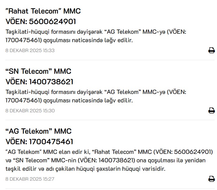 Marja.az-ın məlumatına görə, "Rahat Telecom" MMC şirkəti “AG Telekom” MMC-yə qoşulması nəticəsində ləğv edilir. Həmçinin “SN Telecom” MMC şirkəti də “AG Telekom” MMC-yə (VÖEN: 1700475461) qoşulması nəticəsində ləğv edilir.