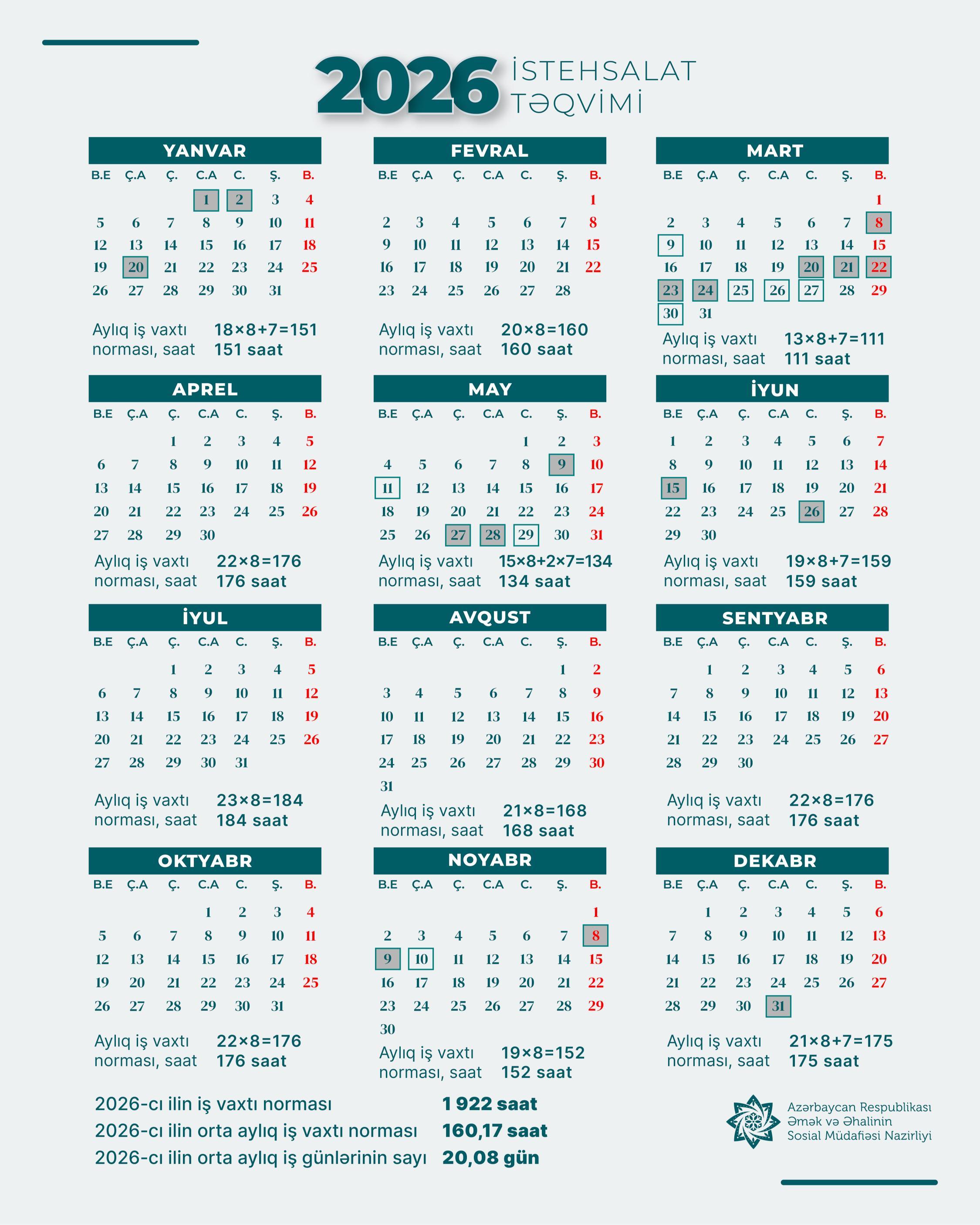 Qanunvericiliyə uyğun olaraq 2026-cı il üçün 40 saatlıq iş həftəsində iş vaxtının illik norması 1922 saat təşkil edir. Altıgünlük iş həftəsi olan iş yerlərində 40 saatlıq iş həftəsində çalışan işçilər üçün 2026-cı ildə beşgünlük iş həftəsi üzrə hesablanmış 1922 saatlıq illik iş vaxtı norması tətbiq edilməlidir.