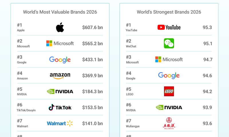 2026-cı ildə Global 500 siyahısında ilk 10 marka ümumi marka dəyərinin 27%-ni təşkil edir ki, bu da ABŞ-ın aparıcı texnologiya nəhənglərinin qlobal iqtisadiyyatda üstünlüyünün davam etdiyini göstərir. İlk onluqdakı markalardan altısı ABŞ texnologiya şirkətləridir. Apple-dan sonra Microsoft 2026-cı ildə 23% artımla 565,2 milyard dollardan çox marka dəyəri ilə dünyanın ikinci ən dəyərli markasıdır. Google (5% artımla 433,1 milyard dollar) və Amazon (4% artımla 369,9 milyard dollar) isə müvafiq olaraq üçüncü və dördüncü yerləri qoruyub. NVIDIA 184,3 milyard ABŞ dolları marka dəyəri ilə dünyanın beşinci ən dəyərli markasıdır.