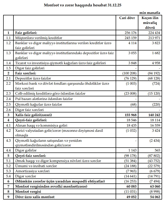 Marja xəbər verir ki, hesabat dövründə Bankın xalis mənfəəti 49 milyon 52 min manat təşkil edib. Bu göstərici 2024-cü ildə qeydə alınmış 54 milyon 62 min manatla müqayisədə 5 milyon 10 min manat və ya 9,3% azalma deməkdir. Xalis mənfəətin azalması əsasən xərclərin sürətli artımı və mümkün zərərlər üçün yaradılan ehtiyatların əhəmiyyətli şəkildə yüksəlməsi ilə bağlıdır.