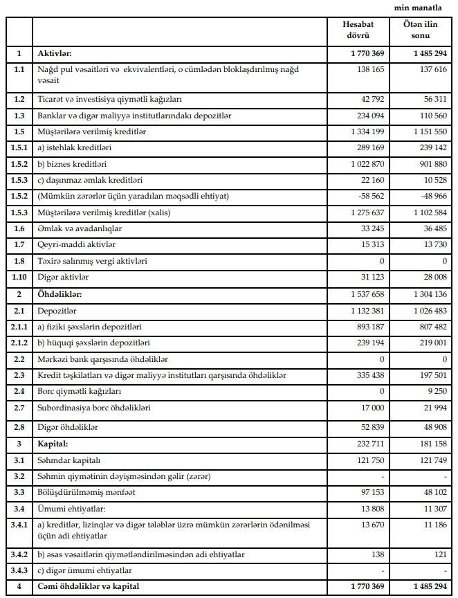 Hesabat dövrünün sonunda Bankın cəmi kredit portfeli (müştərilərə verilmiş kreditlər) 1 milyard 334 milyon 199 min manat olub. Bu, bir il ərzində 182 milyon 649 min manat və ya 15,9% artım deməkdir.