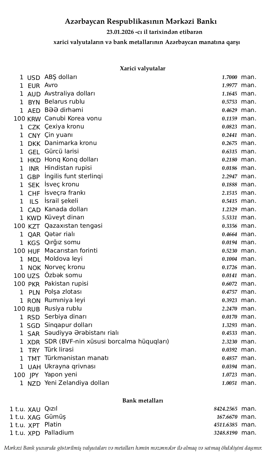 Dolların bazar ertəsi üçün rəsmi məzənnəsi müəyyən olunub