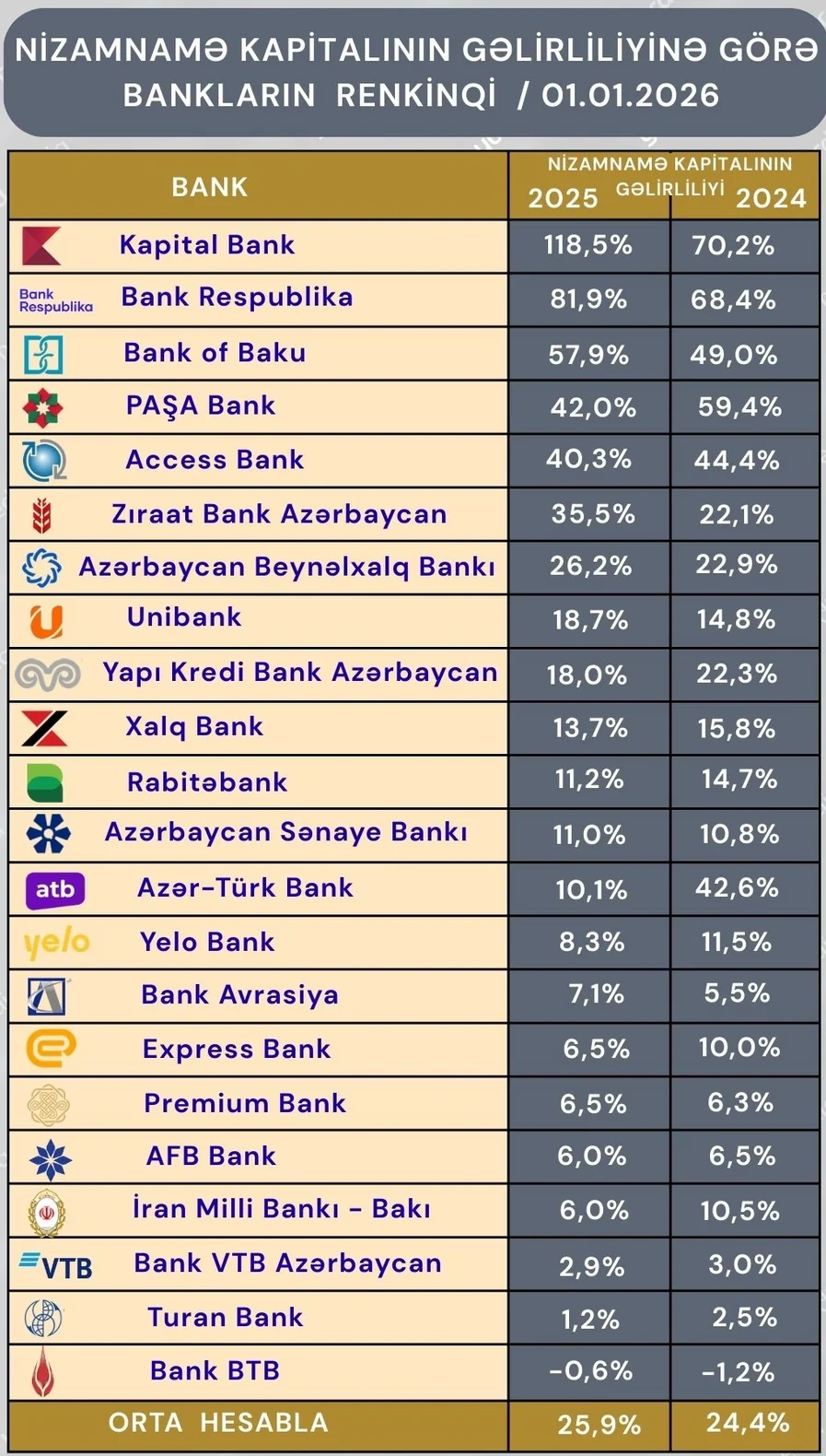 2025-ci ildə Azərbaycan banklarının əldə etdiyi xalis mənfəəti onların bu il yanvarın 1-nə malik olduqları nizamnamə kapitalının 25,9%-i qədər olub.