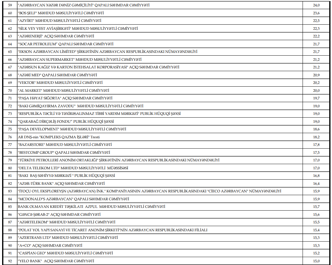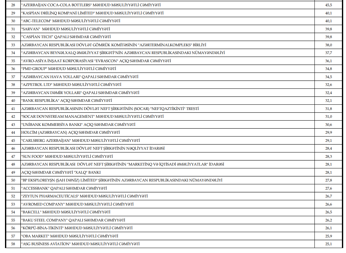 Ötən il "AZERCONNECT GROUP" MMC şirkəti ödədiyi 81,2 milyon manat vergi məbləğilə 17-ci, "Bakcell" MMC şirkəti ödədiyi 26,5 milyon manat vergi məbləğilə siyahıda 54-cü yeri tutub.
