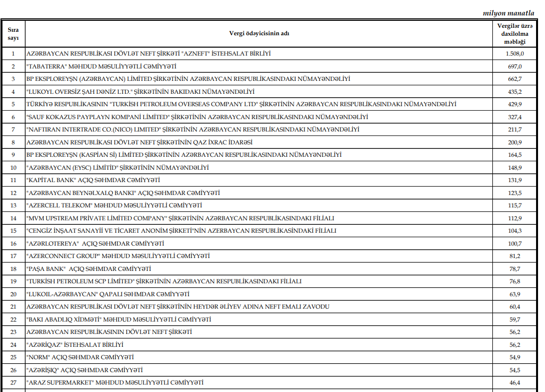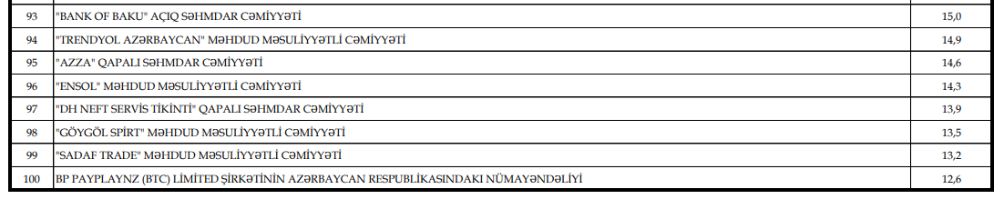 Marja.az bu barədə Dövlət Vergi Xidmətinin açıqladığı "2025-ci ildə ən çox vergi ödəyən və bu barədə məlumatın açıqlanmasına razılıq verən 100 vergi ödəyicisi (büdcə təşkilatları istisna olmaqla)" siyahısına istinadən xəbər verir.