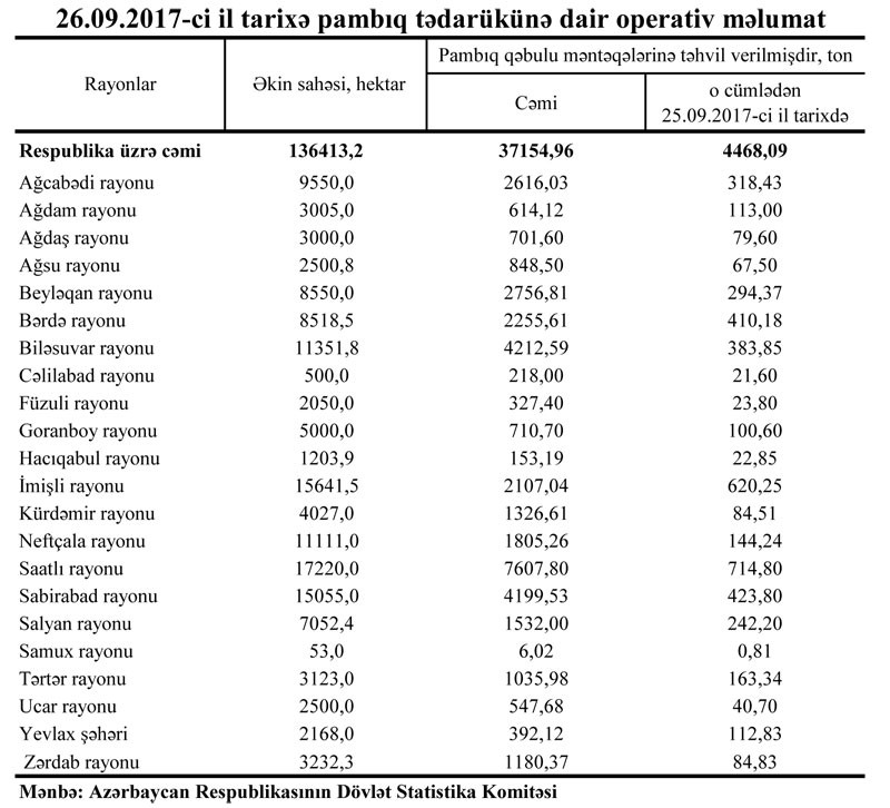 Dövlət Statistika Komitəsi sentyabrın 26-dək ölkə üzrə pambıq tədarükünə dair operativ məlumat yayıb.