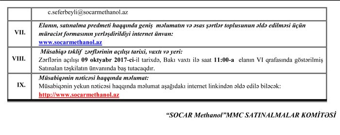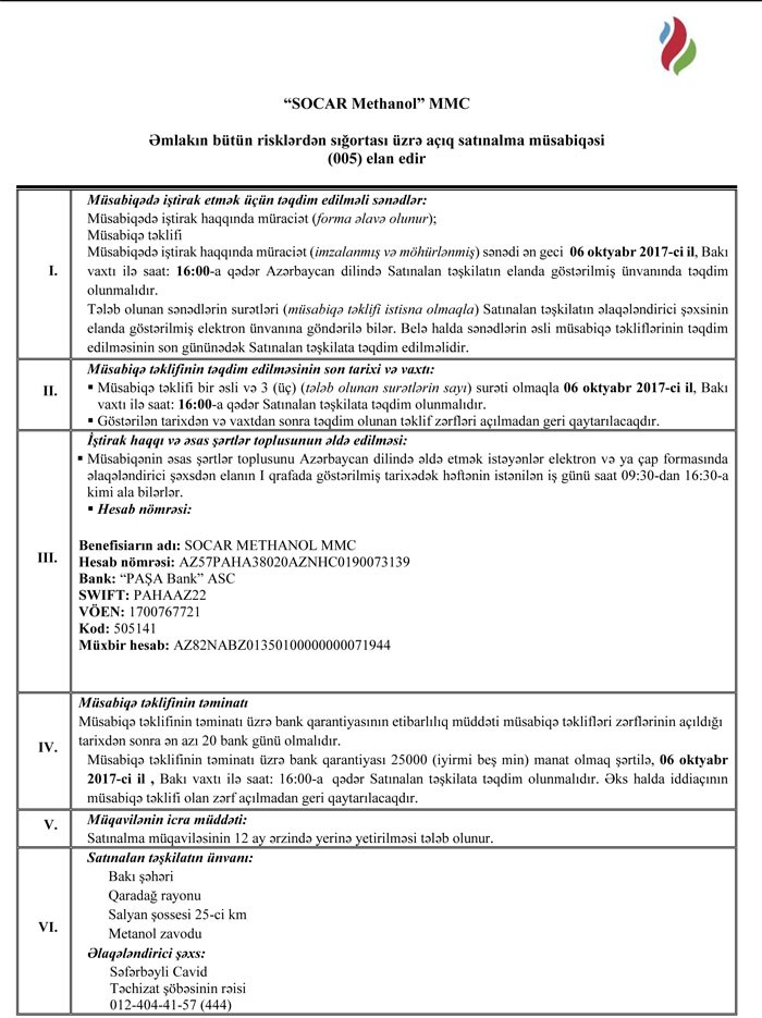 “SOCAR Methanol” əmlakını bütün risklərdən sığortalayacaq- MÜSABİQƏ
