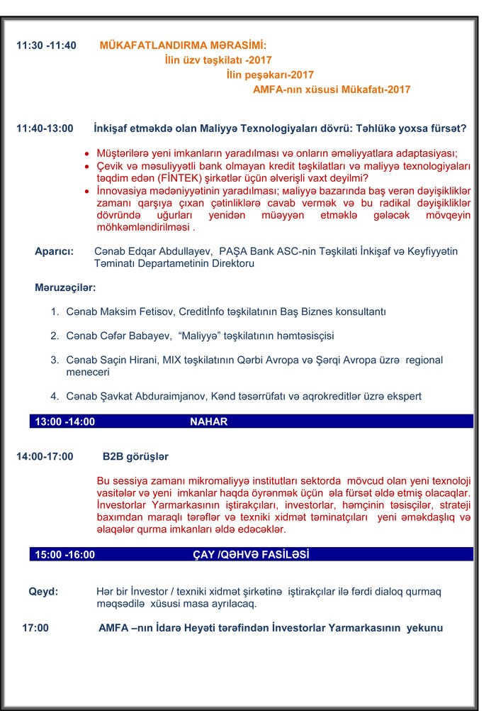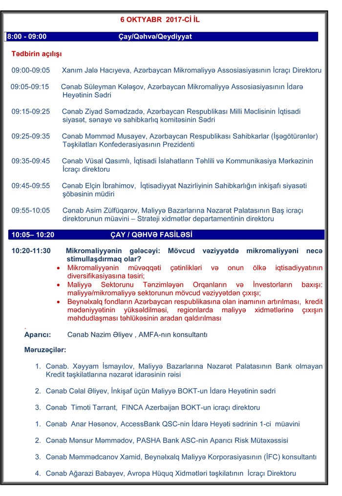 Azərbaycan Mikromaliyyə Assosiasiyasının təşkilatçılığı ilə keçiriləcək tədbirdə mikromaliyyə, ixtisaslaşmış maliyyə ekspert və şirkətləri, beynəlxalq investorlar və texniki xidmət təminatçılarının şirkətləri, bank olmayan kredit təşkilatları və banklar, lizinq təşkilatlarının da iştirakı gözlənilir.