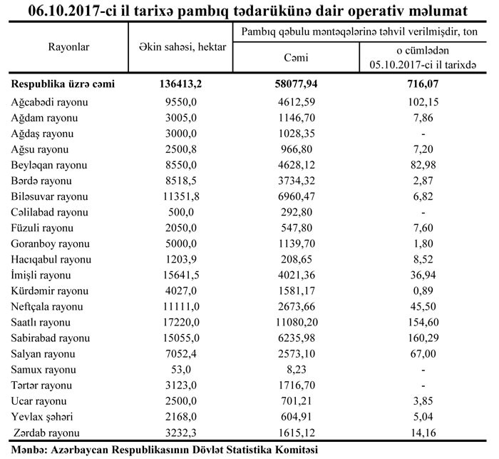 Oktyabrın 6-dək pambıq qəbulu məntəqələrinə ölkə üzrə 58 min 77,94 ton məhsul təhvil verilib.
