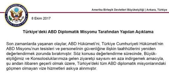 Türkiyənin Xarici İşlər Nazirliyinin sözcüsü Səfir Hüseyin Müftüoğlu, ABŞ Səfirliyi tərəfindən verilən açıqlama ilə bağlı suala, "25 Sentyabr 2017 tarixində terrorla əlaqəli cinayətlərə görə həbs olunan adamın ABŞ Konsulluğunun rəsmi siyahısında adı yoxdur. O şəxs Konsulluğun rəsmi əməkdaşı deyil" cavabını vermişdir.