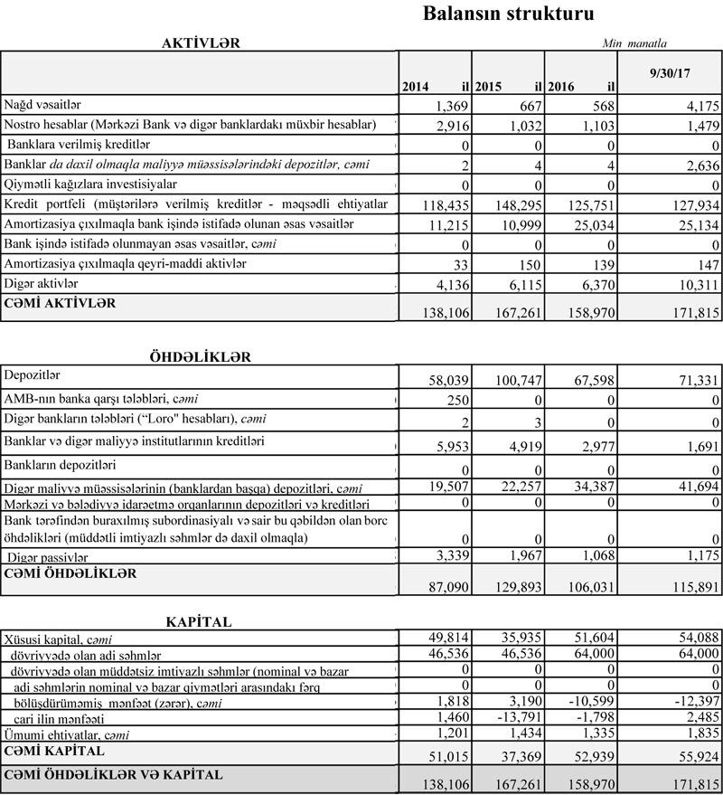 Bankın müştərilərə verdiyi kreditlər 2016-cı ilin sonundakı 125 milyon 751 min manatdan 127 milyon 934 min manata qalxıb. Müqayisə olunan dövrdə depozitlər isə 67 milyon 598 min manatdan 71 milyon 331 min manata yüksəlib.
