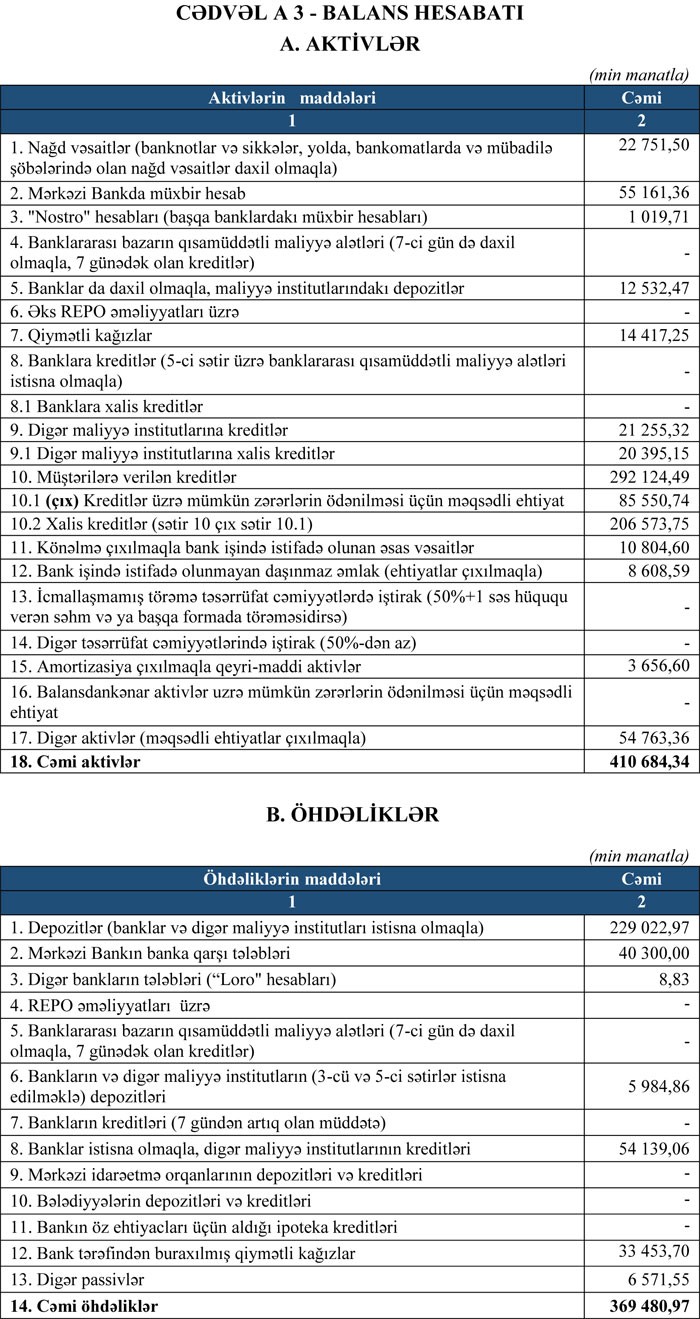 Bank 2016-cı ilin sonunda 439 milyon 726 min manat cəmi aktivlərə, 399 milyon 165 min manat cəmi öhdəliklərə və 40 milyon 561 min manat cəmi kapitala malik olub.