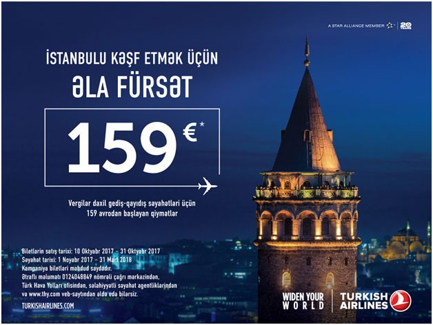 Türk Hava Yolları, İstanbula vergilər daxil 119 avrodan başlayan qiymətlərlə səyahət təmin edən kampaniyaya başlayıb.