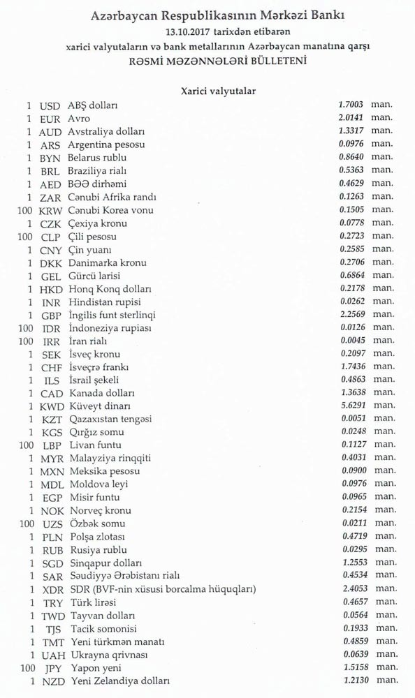 Oktyabrın 12-də rəsmi olaraq 1 dollar 1,7003 manata, 1 avro isə 2.0194 manata, 1 Rubl 0,0294 manata bərabər idi.