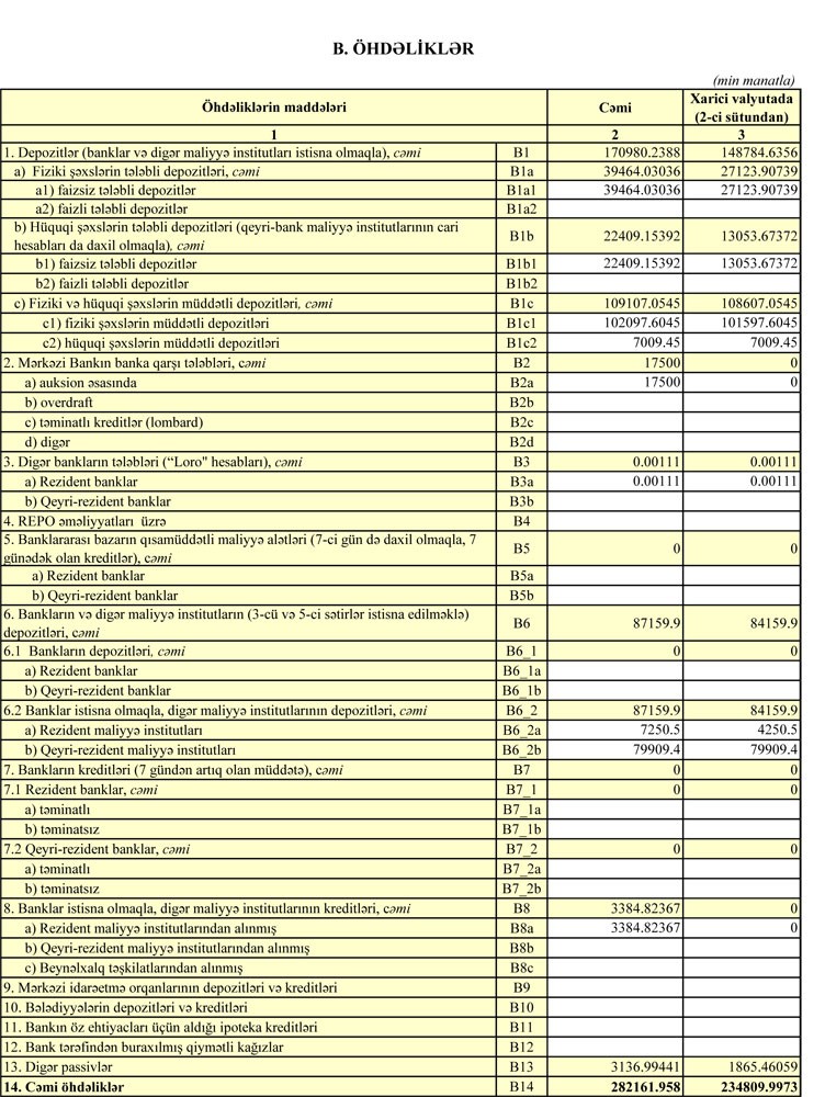 Son 9 ayda müştrilərə verilən kreditlər 388 milyon 332.7 min manatdan 369 milyon 797 min manata geriləyib. Bankda depozitlər isə cüzi - 170 milyon 44.9 min manatdan 170 milyon 980.2 min manata qalxıb. Əhalinin əmanətləri (fiziki şəxslərin müddətli depozitləri) isə 120 milyon 381 min manatdan 102 milyon 97 min manata düşüb.