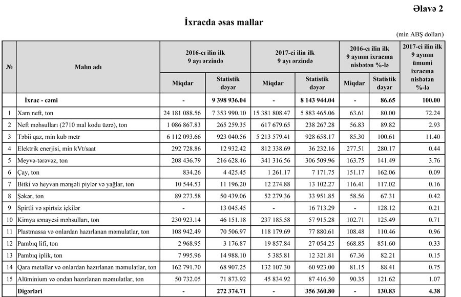 2017-ci ilin yanvar-sentyabr ayları ərzində Azərbaycanın ən çox idxal və ixrac etdiyi mallar.