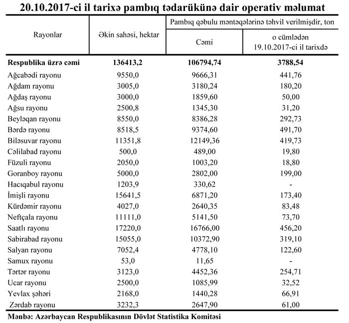 Pambıq tədarükünə dair oktyabrın 20-nə olan operativ məlumatı təqdim edirik.