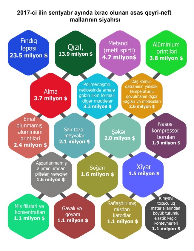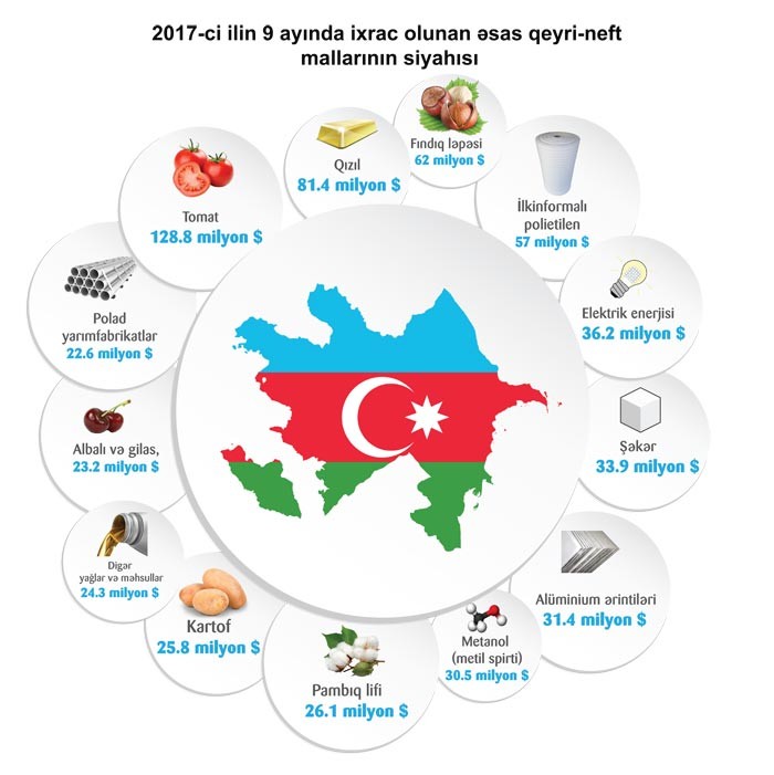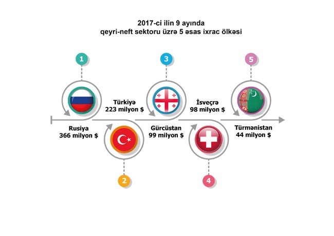 2016-cı ilin müvafiq dövrü ilə müqayisədə 2017- ci ilin 9 ayında qeyri-neft sektoru üzrə ixrac 25 faiz həcmdə artıb. Cari ilin 9 ayı ərzində qeyri-neft məhsullarının ixrac edildiyi ölkələrin siyahısında Rusiya liderliyi qoruyub. Dövlət Gömrük Komitəsinin məlumatına görə, 2017-ci ilin 9 ayı ərzində bu ölkəyə 366 milyon ABŞ dolları dəyərində ixrac olmuşdur. Növbəti yerləri isə Türkiyə (223 milyon ABŞ dolları), Gürcüstan (99 milyon ABŞ dolları), İsveçrə (98 milyon ABŞ dolları) və Türkmənistan (44 milyon ABŞ dolları) bölüşür.