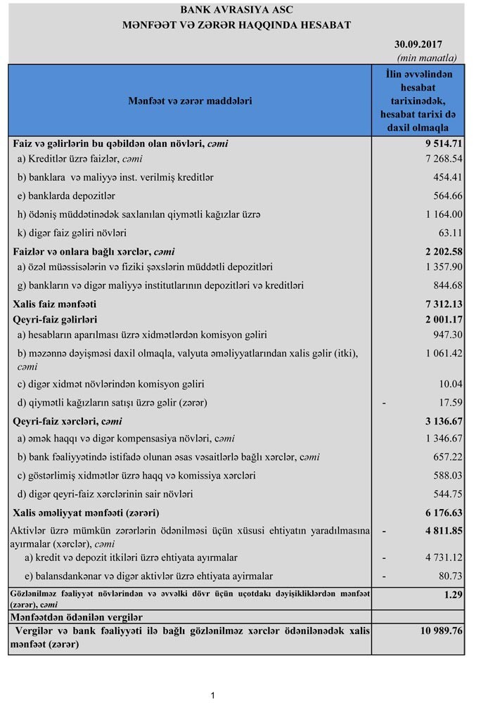“Bank Avrasiya” ASC 2017-ci ilin 9 ayını 10 milyon 990 min manat xalis mənfəət ilə başa vurub.