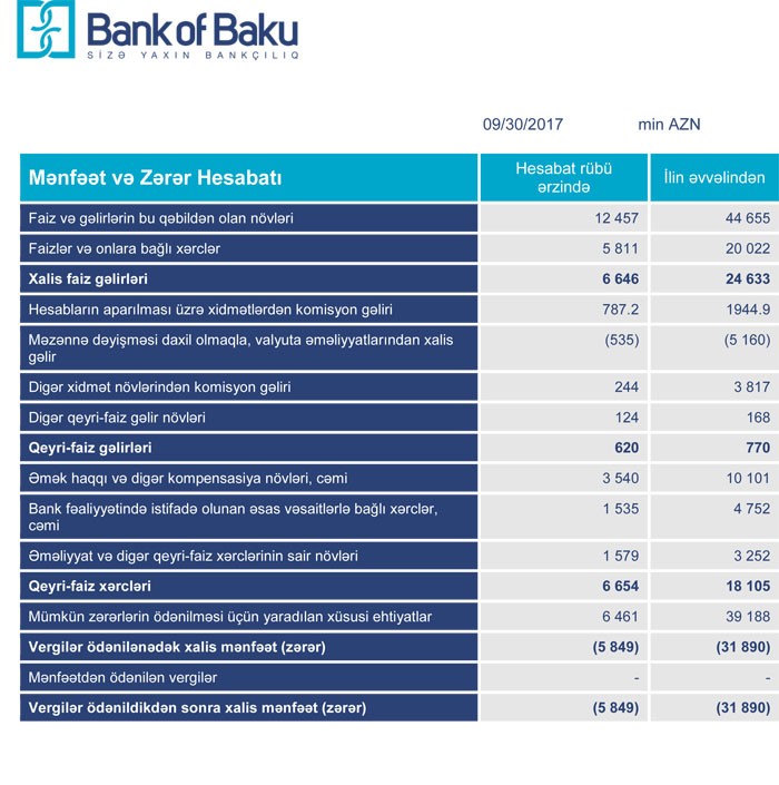 2017-ci ilin 9 ayı ərzində “Bank of Baku” ASC-nin cəmi gəlirləri 45 milyon 425 min manat (faiz gəlirləri 44 milyon 655 min manat, qeyri-faiz gəlirləri 770 min manat) təşkil edib.