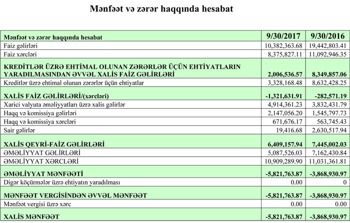 Bank 9 ay ərzində ehtiyatların yaradılmasına təxminən 3 milyon 328 min manat ayırıb.