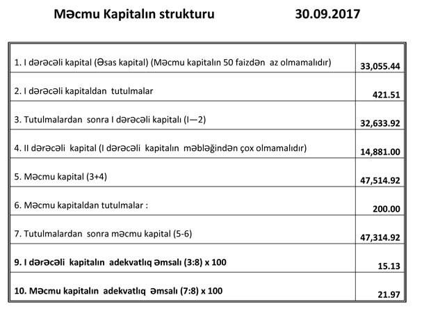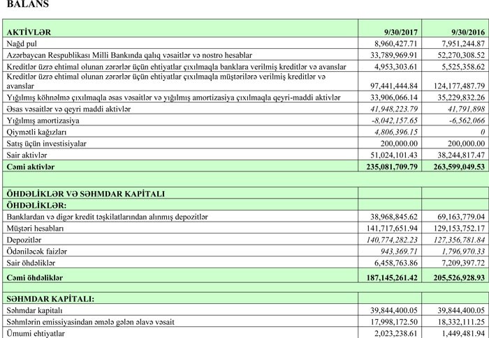 Bankın müştərilərə verdiyi kreditlər 124 milyon 177 min manatdan 97 milyon 441 min manata düşüb, müştəri hesabları isə 129 milyon 154 min manatdan 141 milyon 718 min manata, depozitlər isə 127 milyon 356 min manatdan 140 milyon 774 min manata qalxıb.