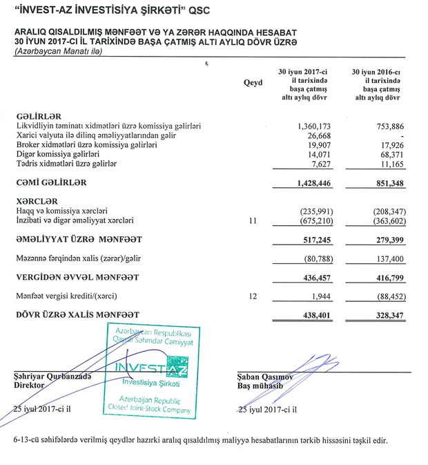 “İnvestAZ İnvestisiya Şirkəti” QSC 2017-ci ilin birinci yarısını 438 min 401 manat xalis mənfəətlə başa vurub.