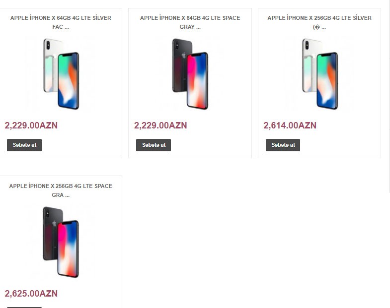 "Almalı" mağazasında isə iPhone X modelinin qiyməti 2229 manatdan başlayır. Ən bahalı iPhone X modeli 2625 manata təklif olunur.