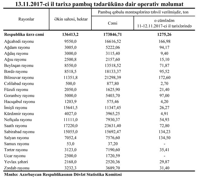 Pambıq tədarükünə dair noyabrın 13-nə olan operativ məlumat