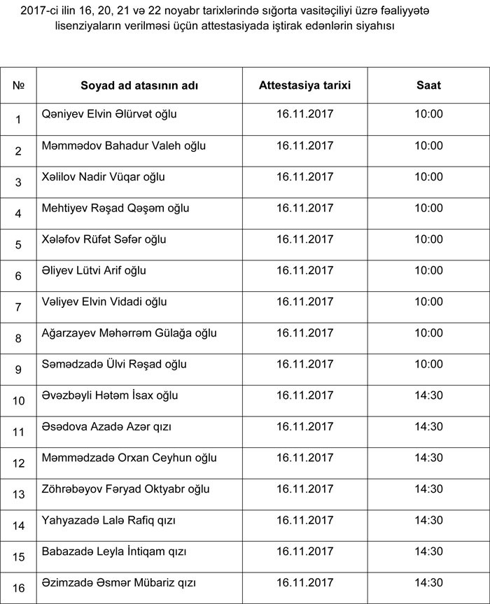 “Sığortaçıların rəhbər işçisi vəzifələrinə namizədlər və müvafiq sığorta vasitəçiliyi üzrə fəaliyyətə lisenziya, həmçinin aktuari fəaliyyətinə aktuari şəhadətnaməsi almaq istəyən fiziki şəxslər üçün attestasiyanın təşkili və keçirilməsi” Qaydalarının 4.1-ci bəndi ilə tənzimlənən attestasiyada ümumilikdə 63 nəfərin iştirakı planlaşdırılır.