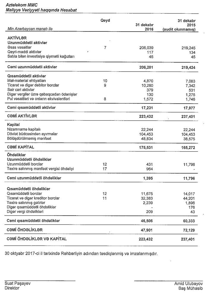 Ötən il şirkətin gəlirləri 5,1% artaraq 90 milyon 882 min manata çatıb. Telekommunikasiya və başqa xidmətlərin maya dəyəri 58 milyon 674 min manat təşkil edib. Eyni zamanda, şirkətin 28 milyon manat inzibati, ümumi və əməliyyat xərcləri olub. Bu xərclər illik müqayisədə 10 milyon manat azalıb (2015-də 38 milyon 146 min manat təşkil etmişdi). Xərclər çıxıldıqdan sonra əməliyyat mənfəəti 4 milyon 189 min manat təşkil edib. Bundan başqa, şirkətin 9 milyon 930 min manat əməliyyat gəliri də olub. Onun mənbəyi haqda hesabatda məlumat verilmir. Nəticədə ötən il "Aztelekom" 11 milyon 223 min manat balans mənfəəti əldə edib. Dövlət büdcəsinə 964 min manat mənfəət vergisi ödənilib.