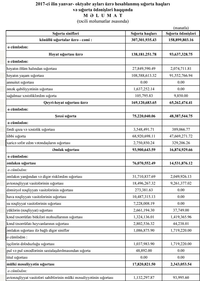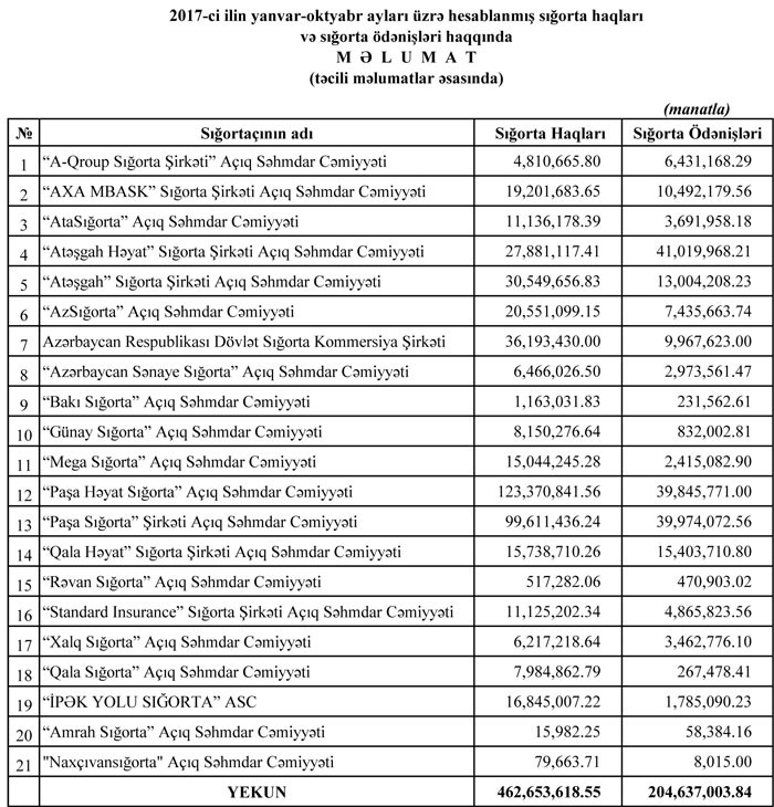 2017-ci ilin yanvar-oktyabr ayları ərzində Azərbaycanda fəaliyyət göstərən 21 sığorta şirkəti tərəfindən 462 milyon 653 min manat sığorta haqqı toplanmışdır.