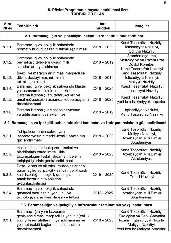 5.0. Azərbaycanda baramaçılığın və ipəkçiliyin inkişafı sahəsində qarşıya qoyulmuş məqsədlərə nail olmaq üçün aşağıdakı istiqamətlərdə zəruri işlərin görülməsi nəzərdə tutulur:
