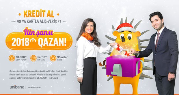Dekabrın 6-dan yanvarın 15-dək Unibankdan kredit alan və ya Unibank kartları ilə alış-veriş edən, Unibank Mobile-da Unibank kartı ilə ödəniş edən müştərilər 10 000 AZN-dən çox uduş fondlu lotereyanın 95 qalibindən biri ola bilərlər. İki qalib lotereyanın ən yüksək mükafatına - 2018 AZN məbləğində pul uduşuna sahib olacaq.