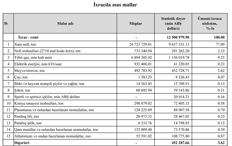 "Marja" xəbər verir ki, Azərbaycanın ixacının 77%-i xam neftin, 9,2%-i təbii qazın, 2,3%-i neft məhsullarının payına düşür.