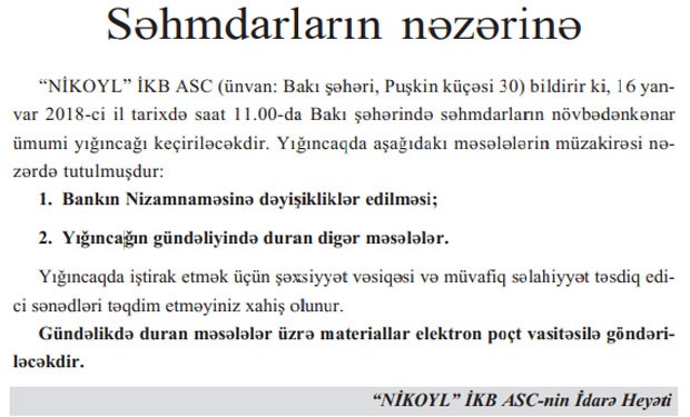 16 Yanvar 2018-ci il tarixində “Nikoyl” İKB ASC-nin səhmdarlarının növbədənkənar ümumi yığıncağı keçiriləcəkdir.