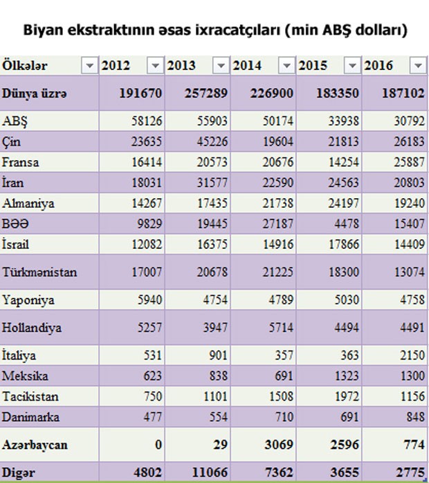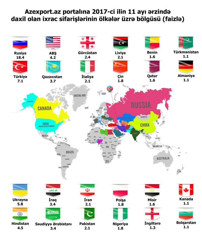 Portala daxil olan ixrac sifarişlərinin ilk beşliyində Rusiya (18.4 %) ilə yanaşı, Türkiyənin (7.1%), Ukraynanın (5.8%), Hindistanın (4.5%) və ABŞ-ın (4.2%) adı vardır. Noyabr ayında Küveyt, CAR, Suriya, Macarıstan, Makedoniya kimi yeni ölkələrdən ixrac sifarişi daxil olub.