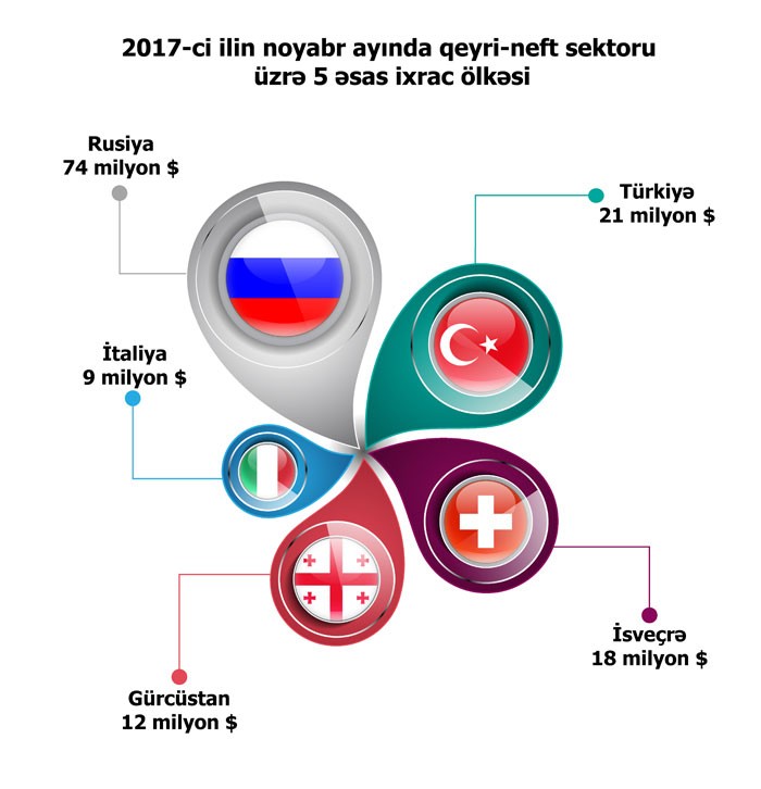 2016-cı ilin müvafiq dövrü ilə müqayisədə qeyri-neft sektoru üzrə ixracın 22 faizdən çox artıb. 2017-ci ilin 11 ayı ərzində ən çox qeyri-neft məhsullarımız Rusiya Federasiyasına ixrac edilib. Belə ki, cari ilin 11 ayı ərzində Rusiyaya 498 milyon, Türkiyəyə 264 milyon, İsveçrəyə 133 milyon, Gürcüstana 120 milyon və İtaliyaya 52 milyon ABŞ dolları dəyərində qeyri-neft sektoruna aid mal ixrac olunub.