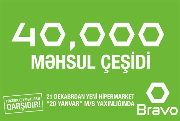 Sizi alış-verişdən zövq alacağınız, 40 000 məhsul çeşidli “20 Yanvar” metro stansiyası yaxınlığında yerləşən yeni Bravo hipermarketdə gözləyirik!