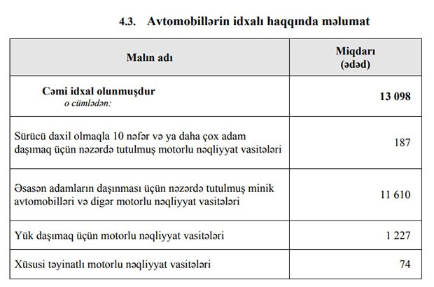 2017-ci ildə Azərbaycana 13 098 ədəd nəqliyyat vasitəsi gətirilib.