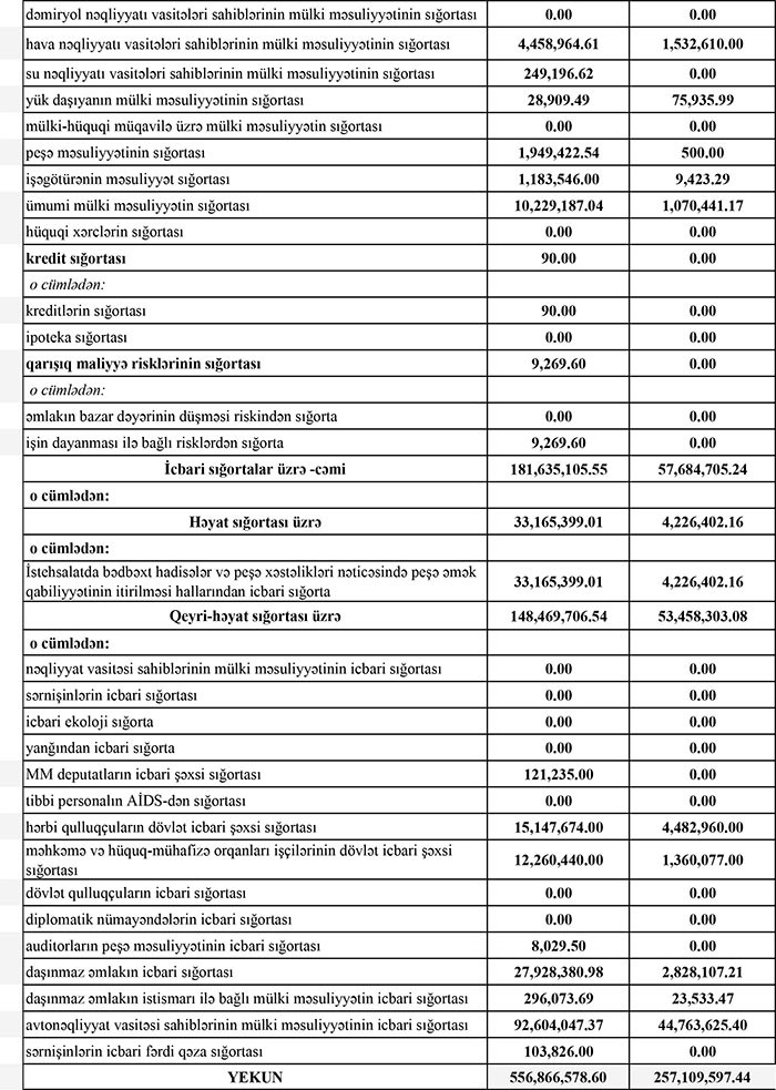 Könüllü sığorta bazarı üzrə haqlar 375 milyon 231 min manat, bu sığorta növləri üzrə ödənişlər isə 199 milyon 425 min manata yaxın məbləğ təşkil edib.