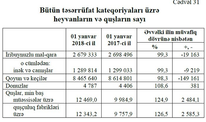 İlkin məlumatlara görə 2018-ci il yanvarın 1-i vəziyyətinə ölkə üzrə 8 milyon 465,6 min baş qoyun və keçi, 2 milyon 679,3 min baş iribuynuzlu mal-qara, o cümlədən 1 milyon 289,8 min baş inək və camışlar mövcud olmuşdur. Qaramal naxırının 48,1 faizini inək və camışlar təşkil edir.