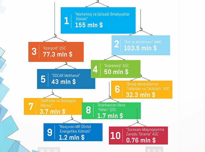 Qeyri-neft sektoru üzrə ixrac əməliyyatlarında iştirak edən dövlətə məxsus şirkətlərin siyahısında isə ilk onluqda ARDNŞ-in “Marketinq və İqtisadi Əməliyyatlar İdarəsi” (155 mln $), “Det-al Alüminium” MMC (103.5 mln $), “Azergold” QS (77.3 mln $), “Azərenerji” ASC ( 50 mln $), “SOCAR Methanol” MMC (43 mln $), “Ərzaq Məhsullarının Tədarükü və Təchizatı” ASC (32.3 mln $), “Geofizika və Geologiya İdarəsi” (3.7 mln $), "Azərbaycan Hava Yolları" QSC (1.7 mln $), “Naxçıvan MR Dövlət Energetika Xidməti”(1.2 mln $) və “Suraxanı Maşınqayırma Zavodu Törəmə” ASC (0.76 mln $) təmsil olunublar.