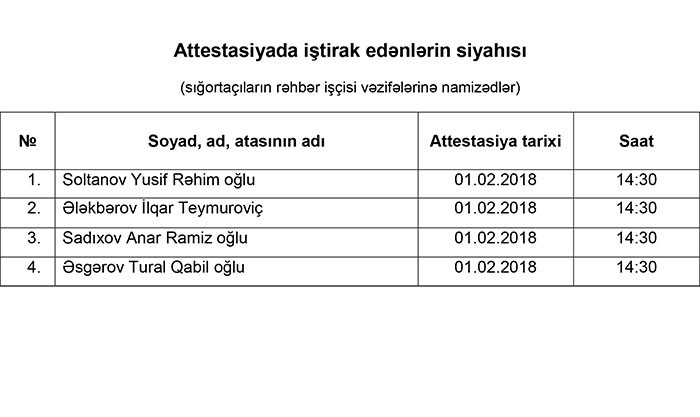 “Sığortaçıların rəhbər işçisi vəzifələrinə namizədlər və müvafiq sığorta vasitəçiliyi üzrə fəaliyyətə lisenziya, həmçinin aktuari fəaliyyətinə aktuari şəhadətnaməsi almaq istəyən fiziki şəxslər üçün attestasiyanın təşkili və keçirilməsi” Qaydalarının 4.1-ci bəndi ilə tənzimlənən attestasiyada 4 nəfər sığorta şirkətlərində rəhbər vəzifəyə təyinatları nəzərdə tutulan şəxslər və 54 nəfər sığorta vasitəçisinin iştirakı planlaşdırılır.