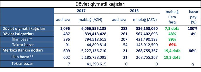 Maliyyə Bazarlarına Nəzarət , 2017-ci ildə qiymətli kağızlar bazarı 2016-cı illə müqayisədə 12% artaraq 15,7 mlrd. manat təşkil etmişdir. Hesabat dövründə dövlət qiymətli kağızlar bazarı 7,3 dəfə, korporativ qiymətli kağızların təkrar bazarı isə 2,8 dəfə artmışdır.