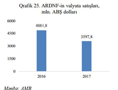 "Marja" xəbər verir ki, Azərbaycan Mərkəzi Bankının 2017-ci il üzrə pul siyasəti icmalına istinadən xəbər verir ki, dövr ərzində ARDNF-in xarici valyuta satışları 3 milyard 597.8 milyon ABŞ dolları təşkil etmişdir ki, bu da 2016-cı il ilə müqayisədə 26.3% azdır.