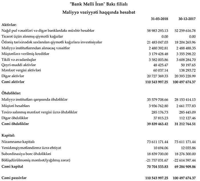 Balans hesabatından məlum olur ki, Bank Melli İran Bakı filialı 31 Mart 2018-ci il tarixində 110 milyon 544 min manat cəmi aktivlərə malik olub. Bu, ötən ilin sonu ilə müqayisədə 10% çoxdur. Filial ötən ilin sonunda 100 milyon 497 min manat cəmi aktivlərə malik idi.